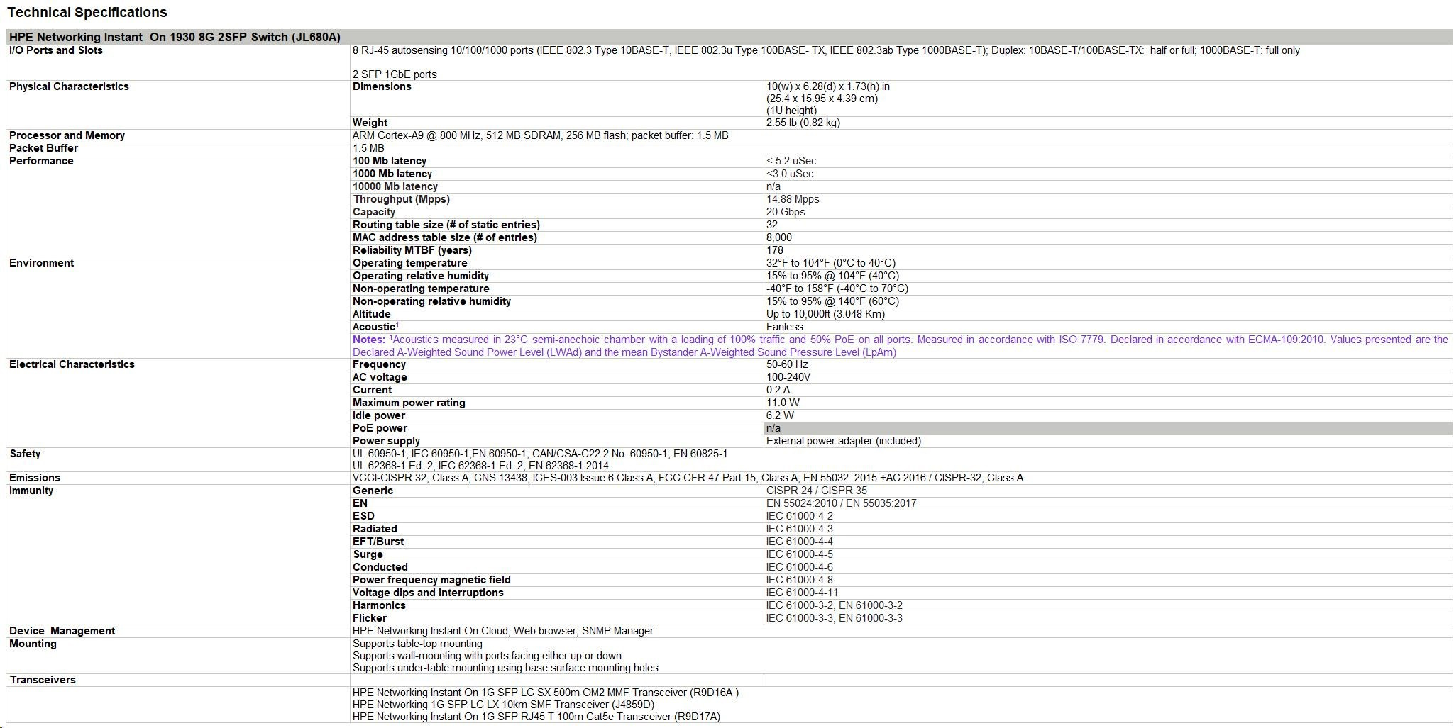 | Notes: 1Acoustics measured in 23°C semi-anechoic chamber with a loading of 100% traffic and 50% PoE on all ports. Measured in accordance with ISO 7779. Declared in accordance with ECMA-109:2010. Values presented are the Declared A-Weighted Sound Power Level (LWAd) and the mean Bystander A-Weighted Sound Pressure Level (LpAm) | ||
