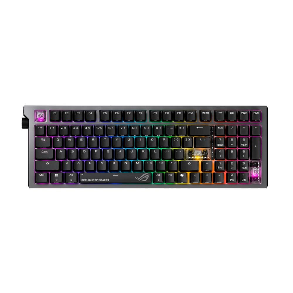 ROG Strix Morph 96 Wireless: Custom herní klávesnice s mechanickými spínači ROG NX V2 s funkcí hot-swap, PCB s orientací na jih (south-facing), připojením ve třech režimech, bezdrátovou technologií ROG SpeedNova, konstrukcí gasket mount s tlumicími vrstvami, třemi nastavitelnými úhly náklonu, odolnými ROG doubleshot ABS klávesami a podporou MacOS.