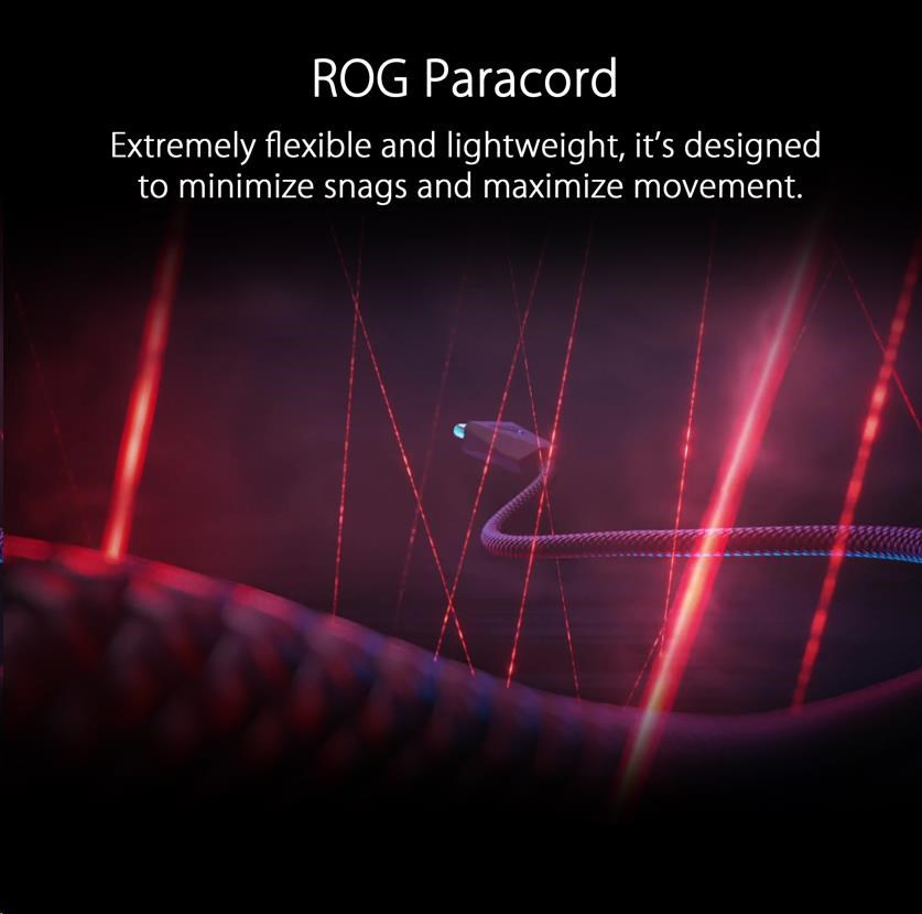 - ROG Paracord - The extremely flexible and lightweight ROG Paracord is designed to minimize snags and maximize movement. The raised port of ROG Spatha X provides space between the cable and tabletop or mousepad surface, minimizing cable drag and noise.
