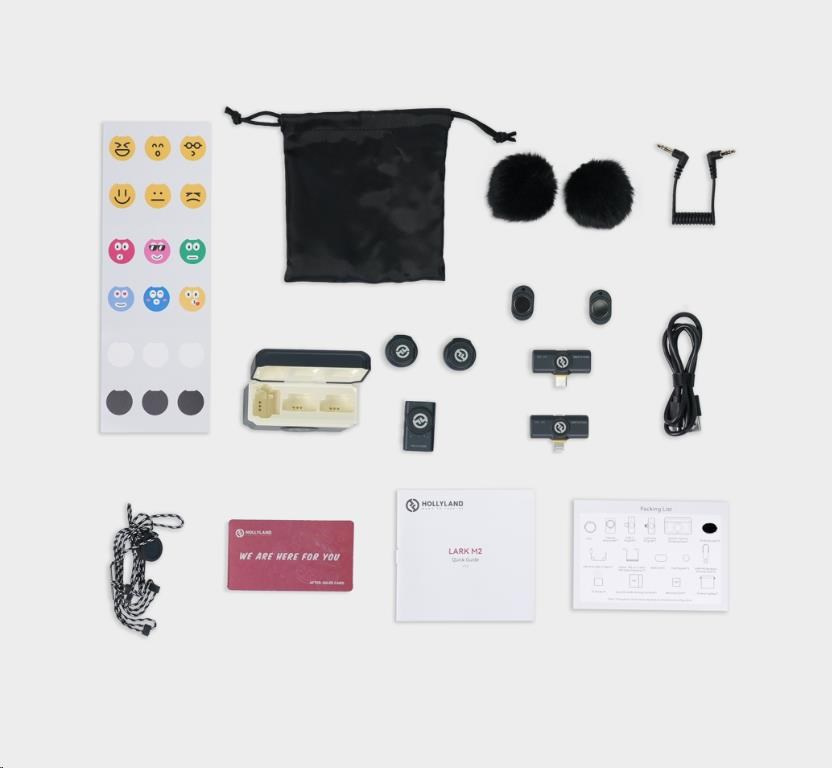 LARK M2 se dodává se sadou užitečného příslušenství, včetně větrných skel pro nahrávání venku, kabelových konektorů pro snadné připojení a speciálně vyrobeného náhrdelníku pro každý TX. S tímto příslušenstvím budete mít vše, co potřebujete k nastavení zařízení LARK M2 a k využívání jeho funkcí.