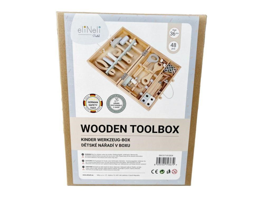 Dřevěné nářadí krásně a přehledně uložené v praktickém dřevěném kufříku nadchne každého malé kutila. Uvnitř kufříku najdou děti nejdůležitější nástroje včetně šroubů, matek a dalších doplňků. Kufřík s poutkem a členěným vnitřním prostorem usnadní dětem úklid i přenášení oblíbené hračky, děti tak mohou mít svou opravářskou a kutilskou sadu stále s sebou, na dovolené, na víkend k babičce..