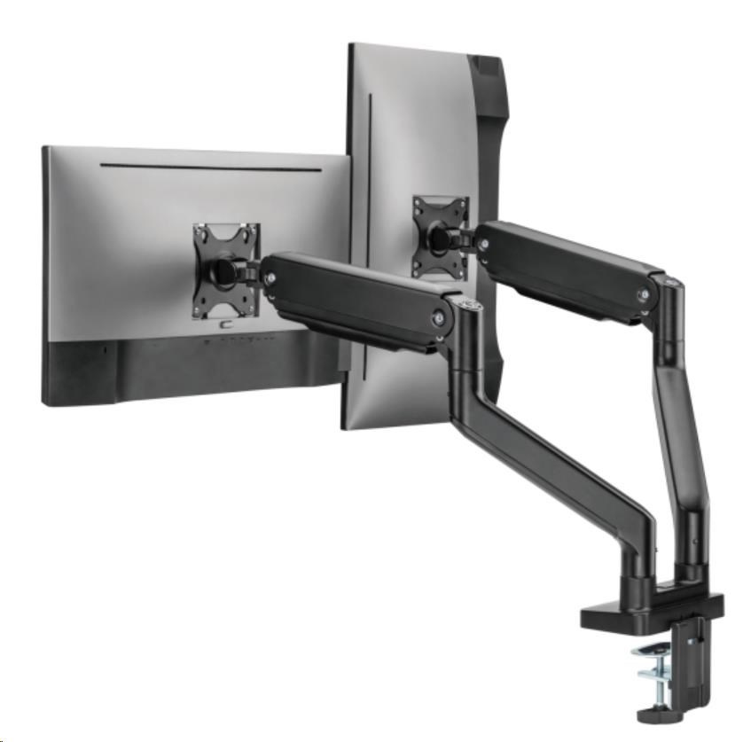 Díky odolné ocelové konstrukci poskytuje stabilní podporu pro dva monitory s úhlopříčkami 17" až 35" a hmotností až 16 kg. Flexibilní konstrukce pro dostatečné nastavení výšky a pozorovacích úhlů s možností nastavení orientace monitoru na výšku nebo na šířku. Součástí balení jsou průchodky a svorky pro instalaci na téměř jakoukoliv pracovní plochu. Odnímatelná deska VESA pro uživatelsky přívětivou instalaci.