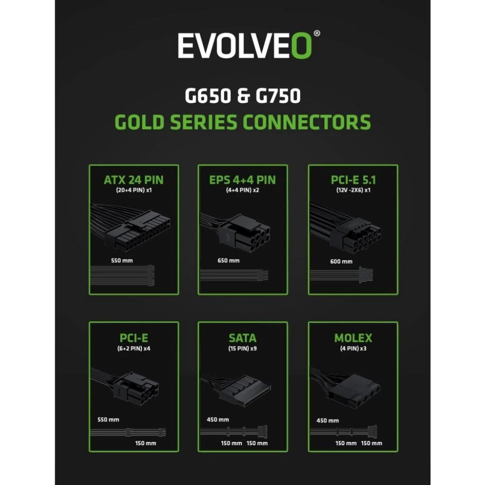 EVOLVEO G750 zdroj 750W, 80+ GOLD, ATX 3.1, aPFC, 140 mm ventilátor, záruka 3 roky, bílý