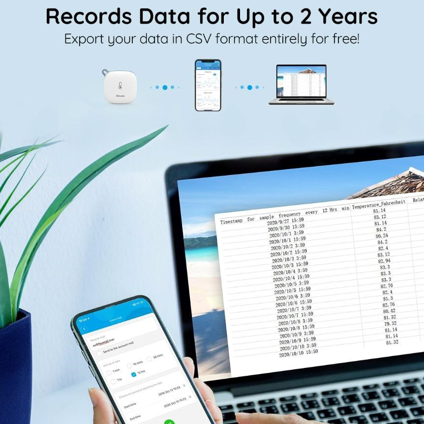 Díky okamžitým upozorněním v aplikaci Govee Home máte neustále přehled o tom, kdy teplota nebo vlhkost překročí vámi nastavené limity. To je ideální pro ochranu rostlin, vína, domácích mazlíčků nebo citlivé elektroniky, kde záleží na stabilních podmínkách. Zařízení zároveň umožňuje ukládání a export naměřených dat až po dobu 2 let, což usnadňuje dlouhodobé sledování trendů a vyhodnocení změn prostředí. Díky tomu získáte reálný přehled o vývoji klimatu v čase, nejen aktuální hodnoty. To vše je navíc zabalené do malého, lehkého a přenosného designu, který lze snadno umístit kamkoli bez rušení prostoru.