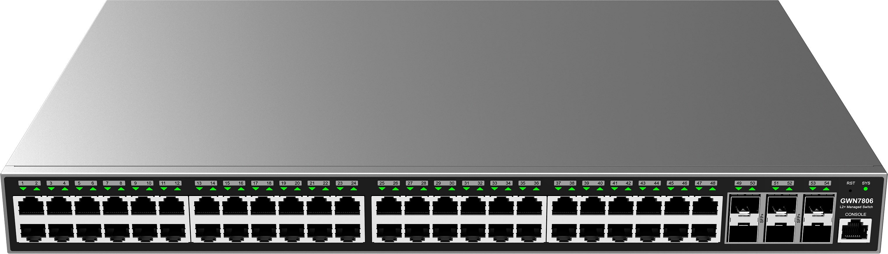 GWN7806(P) je vysoce výkonný spravovaný síťový přepínač vrstvy 2+ s 48 porty, který malým a středním podnikům umožňuje budovat škálovatelné, bezpečné a inteligentní podnikové sítě s plnou správou