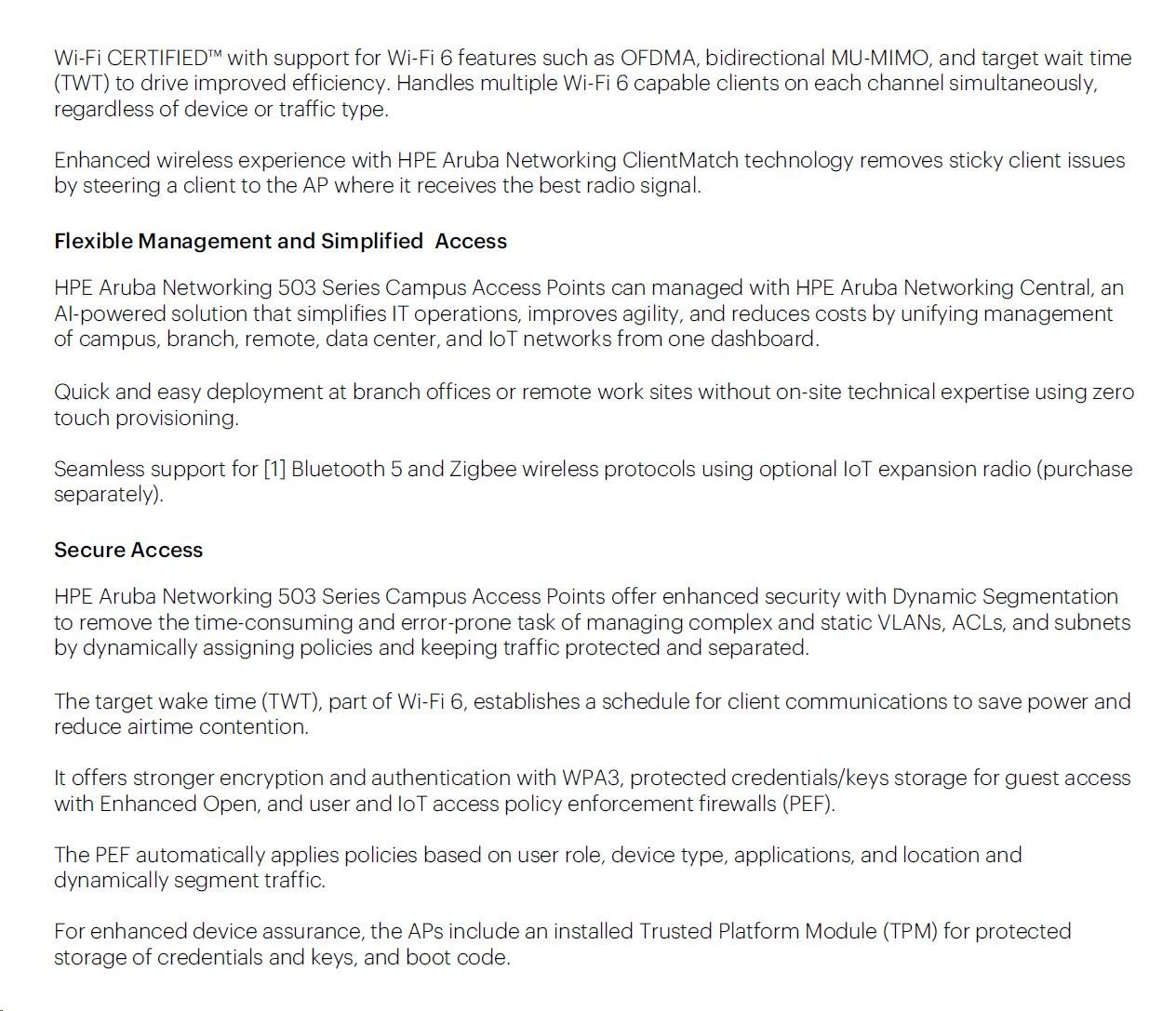 | Aruba Secure Infrastructure The Aruba 503 Series supports a Zero Trust/Secure Access Service Edge (SASE) architecture to better protect user authentication and wireless traffic. Select capabilities include: