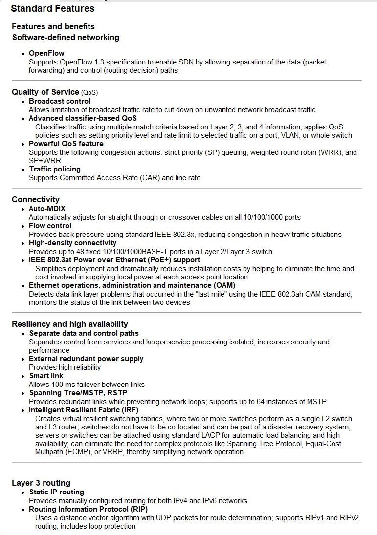 - Intelligent Resilient Fabric (IRF) Technology: Unifies multiple switches into one logical device, improving network resilience, performance, and availability while simplifying operations.