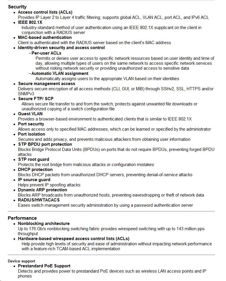 Provides up to 30 W per port that allows support of the latest PoE+-capable devices such as IP phones, wireless access points, and security cameras, as well as any IEEE 802.3af-compliant end device; eliminates the cost of additional electrical cabling and circuits that would otherwise be necessary in IP phone and WLAN deployments