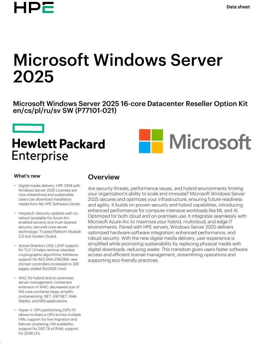 HPE Microsoft Windows Server 2025 16-core Datacenter Reseller Option Kit (CZ EN Russia Pol Sw).