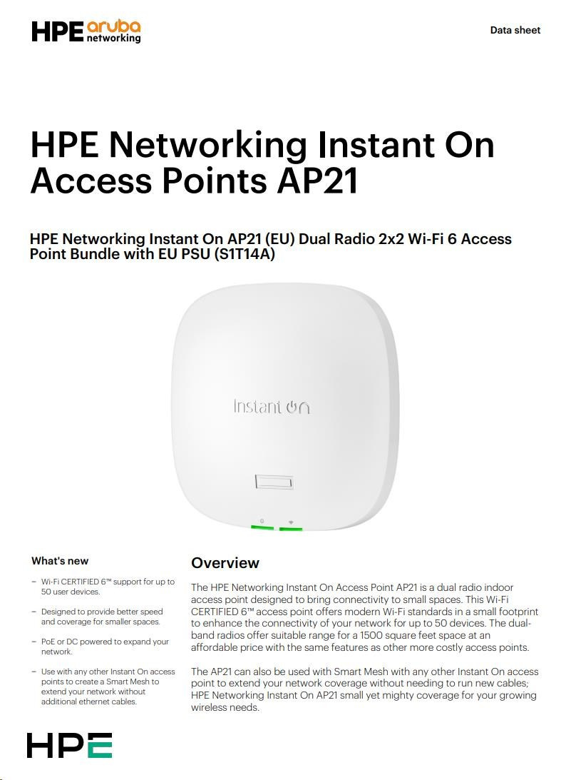 HPE Networking Instant On AP21 (EU) Dual Radio 2x2 Wi-Fi 6 Access Point Bundle with EU PSU