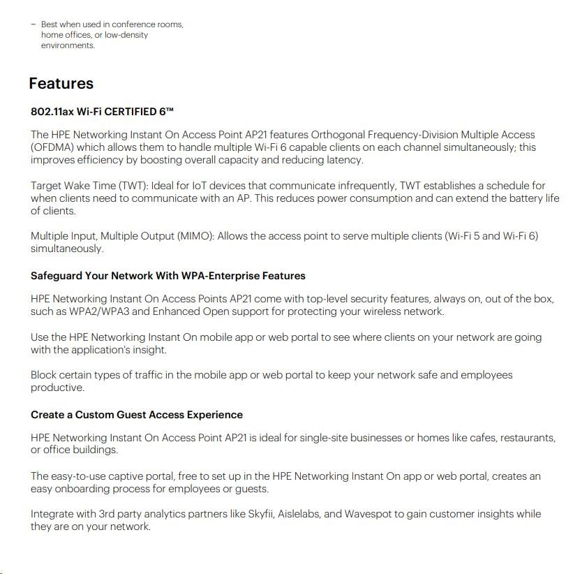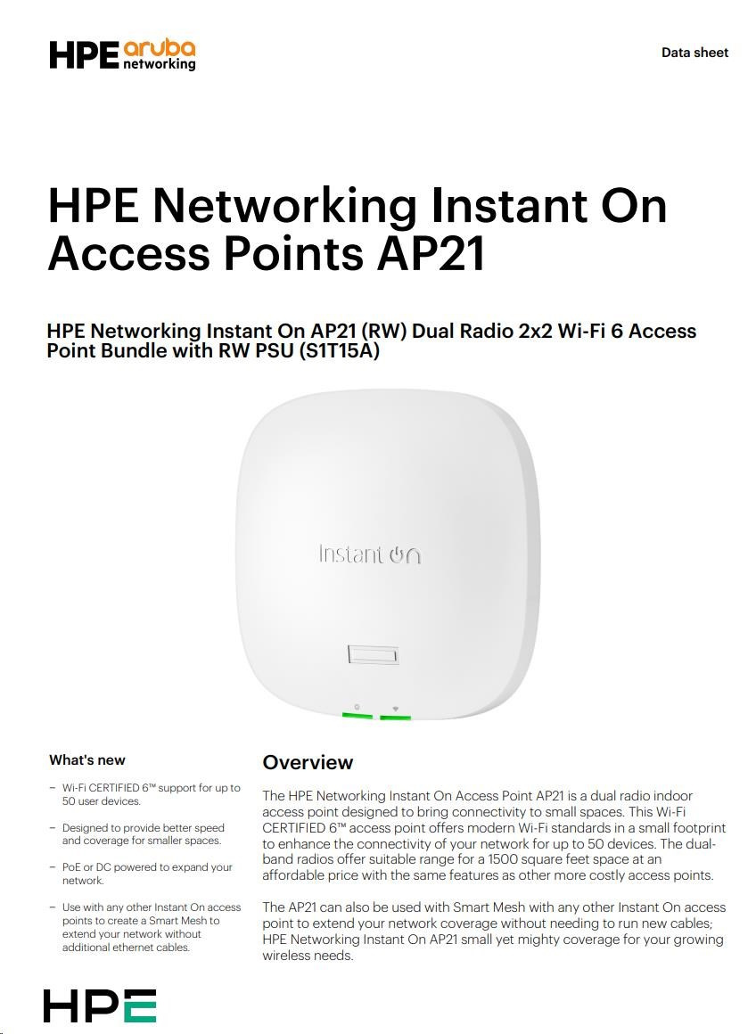 HPE Networking Instant On AP21 (RW) Dual Radio 2x2 Wi-Fi 6 Access Point Bundle with RW PSU