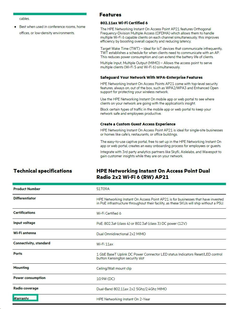 HPE Networking Instant On Access Point AP21 is ideal for single-site businesses or homes like cafe’s, restaurants, or office buildings. The easy-to-use captive portal, free to set up in the HPE Networking Instant On app or web portal, creates an easy onboarding process for employees or guests. Integrate with 3rd party analytics partners like Skyfii, Aislelabs, and Wavespot to gain customer insights while they are on your network.