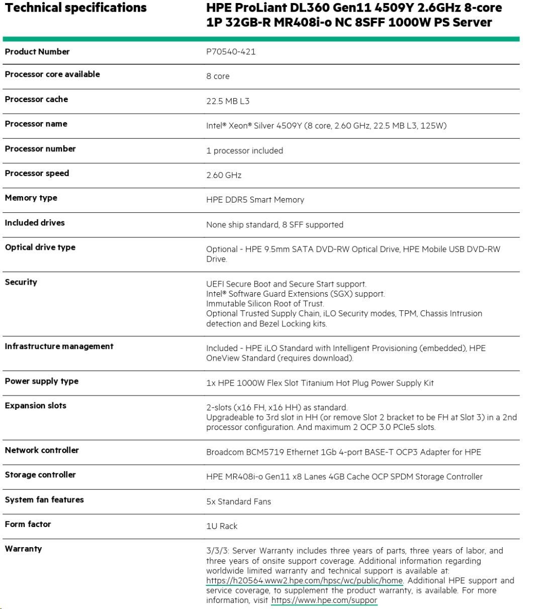 | Model Name | HPE ProLiant DL360 Gen11 4509Y 2.6GHz 8-core 1P 32GB-R MR408i-o NC 8SFF 1000W PS Server |