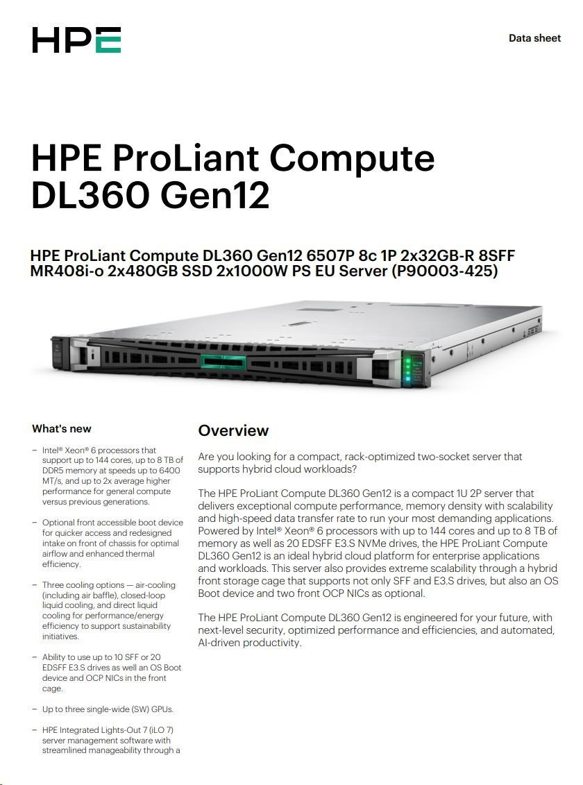 | Model Name | HPE ProLiant Compute DL360 Gen12 6507P 8c 1P 2x32GB-R 8SFF MR408i-o 2x480GB SSD 2x1000W PS EU Server |