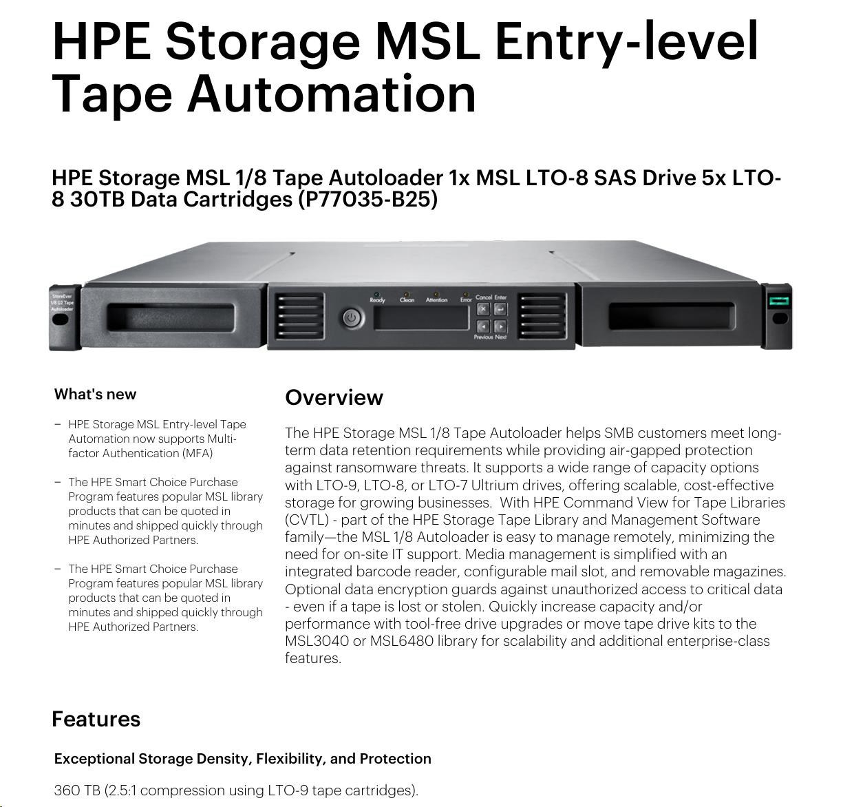 HPE Storage MSL 1/8 Tape Autoloader 1x MSL LTO-8 SAS Drive 5x LTO-8 30TB Data Cartridges.