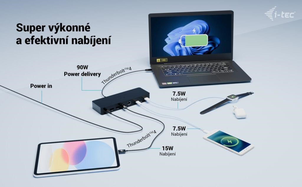 Díky množství USB portů (včetně USB 3.2 Gen 2 s rychlostí až 10 Gbps), portu Thunderbolt“ 4 nabízejícímu buď výstup v 8K, nebo ultra rychlý přenos dat 40 Gbps, a spolehlivému vysokorychlostnímu LAN připojení je tato dokovací stanice ideálním řešením pro náročné profesionály. Samozřejmostí je také podpora napájení až 90 W pro nabíjení notebooku nebo tabletu.