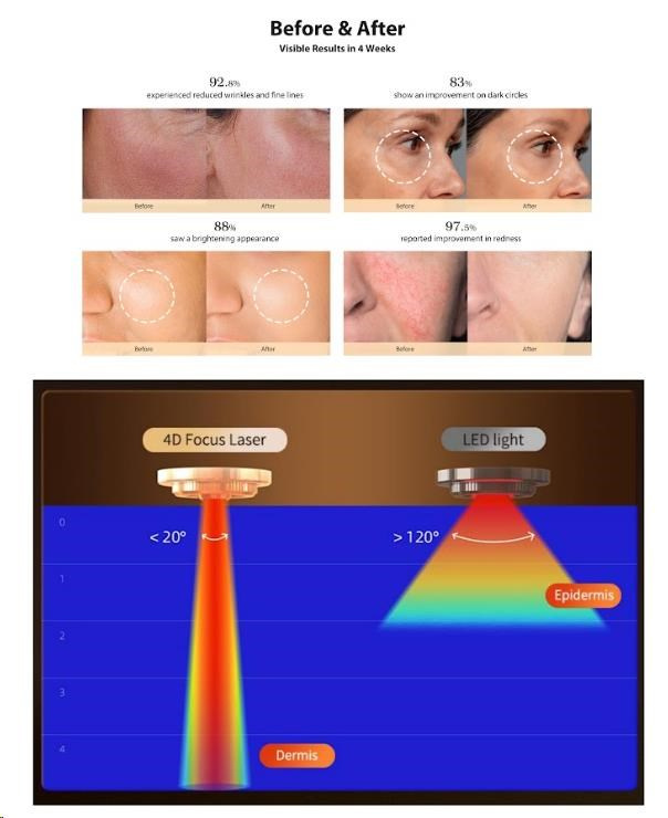 Tato maska není jen dalším LED zařízením na trhu. Využívá průlomovou technologii ultra úzkého FPT laseru, který je až 6x výkonnější než běžné LED světlo a jehož paprsky pronikají hluboko do struktury pleti. Unikátní 4D systém, tvořený 140 laserovými paprsky, cílí s maximální přesností na čtyři klíčové zóny obličeje. Každá zóna je ošetřena specifickou vlnovou délkou laseru, aby se zaměřila na konkrétní problém – od vrásek na čele přes tmavé kruhy pod očima až po nosoretní rýhy a povadlou pleť na tvářích.