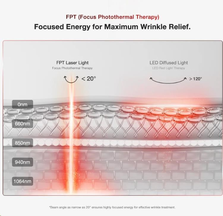 Zatímco většina domácích masek spoléhá na technologii LED, JOVS 4D jde o krok dál. Využívá pokročilou FPT (Focal Photothermal Therapy) technologii , která koncentruje energii laseru do úzkých paprsků s úhlem menším než 20° , na rozdíl od více než 120° u běžných LED. Díky tomu pronikají mnohem hlouběji do dermis – vrstvy kůže, kde vzniká kolagen. Díky 6x vyšší energetické účinnosti oproti LED diodám dokáže laser efektivněji stimulovat buněčnou obnovu a cíleně řešit příčiny stárnutí pleti.