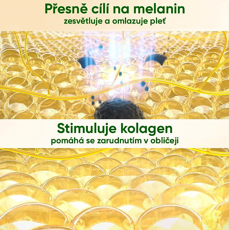• Režim WHITEN (Bělení skvrn): Cíleně se zaměřuje na tmavé pigmentové skvrny, pihy a stopy po akné. Energie je pohlcena nahromaděným melaninem, který se teplem rozloží na menší částečky a tělo je následně přirozeně odbourá. Skvrny tak postupně blednou a stávají se méně viditelnými.