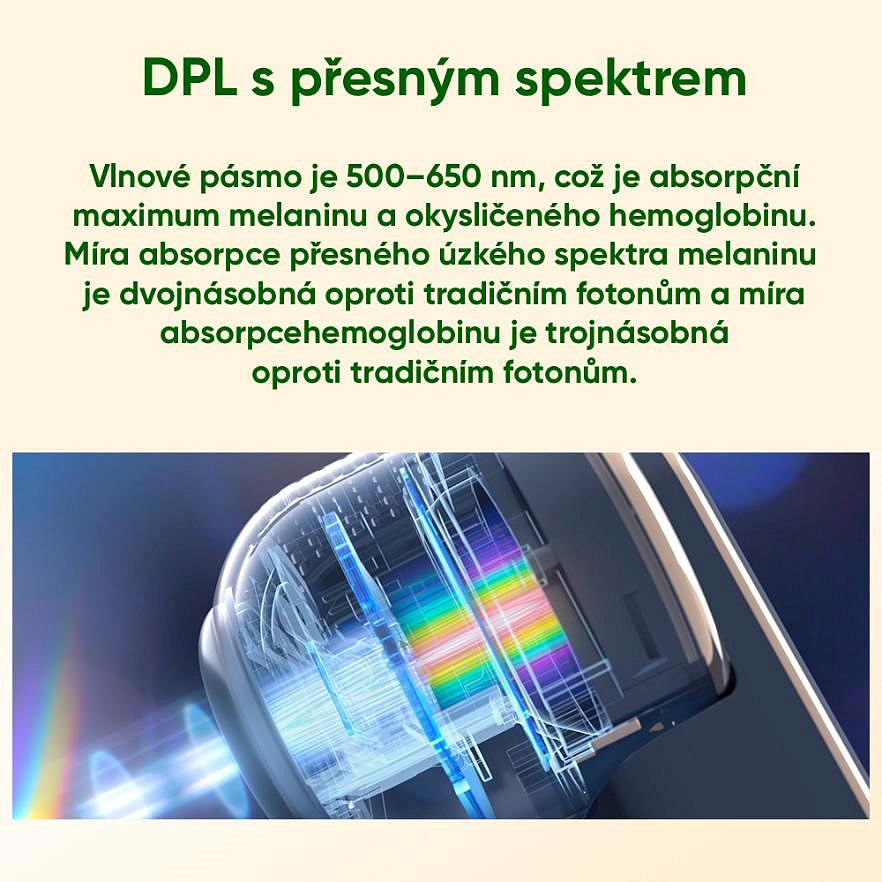 • Vyšší účinnost než IPL: DPL technologie má 2x efektivnější absorpci melaninu a 3x efektivnější absorpci hemoglobinu než tradiční IPL.