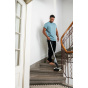 Podlahová myčka FC 2-4 je skvělým pomocníkem při úklidu díky své samonosné konstrukci a lehké váze pouhých 2,2 kg. Díky automatickému zapínání a vypínání je ovládání velmi intuitivní – stačí jednoduše zatáhnout za rukojeť čističe směrem dozadu a myčka se sama spustí. V jediném kroku pak snadno odstraní suché i mokré každodenní nečistoty. Baterie vystačí až 20 minut čištění, což je dostačující pro úklid plochy o rozloze cca 70 m2. Válec myčky se po aktivaci automaticky navlhčí vodou z nádrže na čerstvou vodu, což zajišťuje rovnoměrné a efektivní čištění tvrdých podlah vždy čistou vodou. Myčka umožňuje čištění až po okraj a díky integrovaným vlasovým filtrům lze snadno sbírat i vlasy a další nečistoty. Integrovaná hygienická nádrž na špinavou vodu zamezuje kontaktu s nečistotami a po použití ji lze snadno vyjmout a vyčistit. Přiložená výměnná baterie 4V od Kärcher Battery Power je kompatibilní se všemi 4V zařízeními této značky.