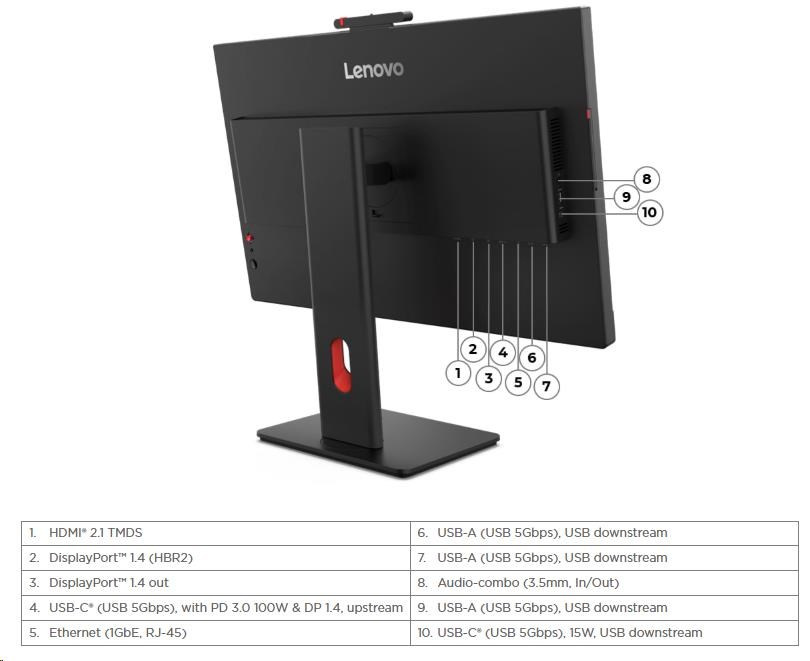 | Speciální funkce | HDR10 Compliance Lenovo ThinkColour (Lenovo Accessories and Display Manager) Support Lenovo ThinkColour podporuje Windows 10 & 11, Mac OS (funkce se liší podle systému). Lenovo Accessories and Display Manager je dřívější Lenovo Display Control Center. LDFM (Lenovo Display Fleet Manager) Zrcadlené tlačítko napájení Natural Low Blue Light Smart Power |