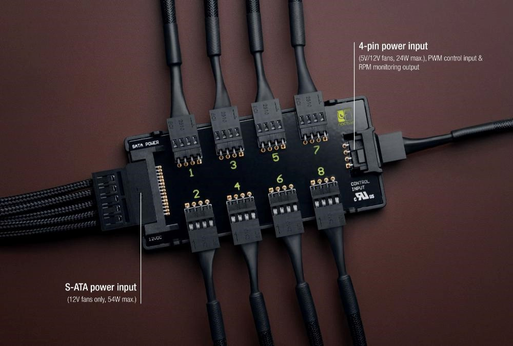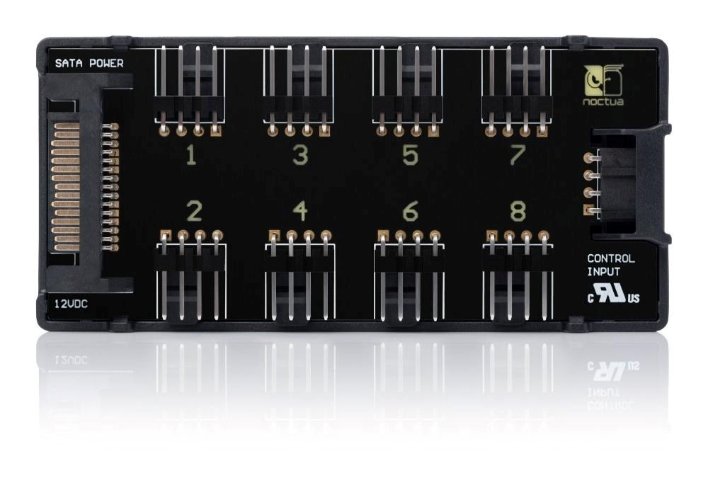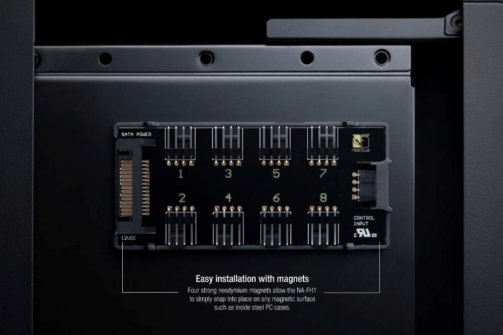NA-FH1 je vysoce kvalitní, chytře chráněný 8kanálový rozbočovač ventilátorů PWM, který umožňuje spustit a ovládat až osm ventilátorů PWM současně prostřednictvím jediné hlavičky ventilátoru PWM na základní desce nebo samostatných regulátorů, jako je volitelný NA-FC1. Ventilátory bez PWM lze ovládat nastavením vstupního napětí. Díky podpoře 12V i 5V ventilátorů se 4pólovými PWM a 3pólovými konektory je NA-FH1 vysoce flexibilní a vhodný jak pro prostředí PC, tak pro další aplikace založené na 12V nebo 5V. Může být napájen buď přes vstup S-ATA (pro 12V ventilátory, až 54 W), nebo přes 4pinový vstup PWM (pro 5V a 12V ventilátory, až 24 W), přičemž oba jsou chráněny proti nadproudu samonastavovací pojistkou pro maximální bezpečnost i v případě zkratu na připojených zařízeních nebo kabelech.