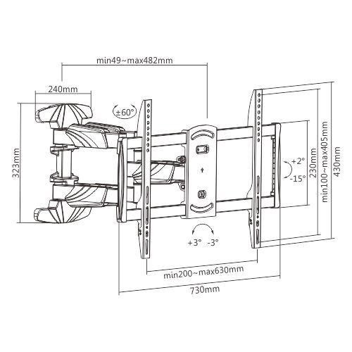 Profesionální otočný držák na televize Fiber Super-3 Držák na televize 43-75", otáčení do stran +/-60°, naklápění +2°/-15°, korekce roviny +/-3°, vzdálenost Tv od zdi 49-482mm, vedení kabeláže, VESA 200x100 až 600x400, nosnost 45kg Nástěnný držák vynikající profesionální kvality a v krásném dizajnovém provedení, který je ideální pro zavěšení televize s úhlopříčkou 43" až 75". Držák Vám umožní s televizí otáčet na obě strtany až o 60°, naklopit ji nahoru +2° nebo dolů až o -15°, upravit její rovinu o +/-3° a měnit vzdálenost od zdi od 49mm až do 482mm. Držák podporuje VESA standardy pro zavěšení Tv 200x100 až 600x400 a zvládá maximální hmotnost až 45kg. Celá konstrukce je ocelová, nástěnný úchyt a ramena držáku jsou opatřena dizajnovými kryty se systémem pro vedení kabeláže. V balení naleznete instalační materiál. Barevné provedení černé, o kvalitě a spolehlivosti držáku svědčí i poskytované záruka 10 let. Profesionální nástěnný držák na televize Fiber Super-3 Technické údaje: nosnost 45kg na televize a monitory s úhlopříčkou 43" až 75" podporované velikosti VESA standardů 200x100 až 600x400 otáčení televize do stran +/- 60° naklápění televize nahoru +2° a dolů až -15° nastavení vzdálenosti od zdi 49mm až 482mm korekce roviny obrazovky +/- 3° dizajnové krytky se systémem pro vedení kabeláže ocelová konstrukce snadná montáž a polohování televize instalační materiál barevné provedení černé záruka 10 let Ramena držáku Fiber Super-3 jsou opatřena dizajnovými krytkami se systémem pro vedení kabeláže Držák Tv Fiber Super-3 podporuje VESA standardy: VESA 200x100 VESA 200x200 VESA 300x200 a 200x300 VESA 300x300 VESA 400x200 a 200x400 VESA 400x300 a 300x400 VESA 400x400 VESA 600x400 Na držák Fiber Super-3 můžete zavěsit všechny typy a značky Tv i monitorů, které: mají maximální hmotnost 45kg podporují kterýkoliv z výše uvedených VESA standardů.