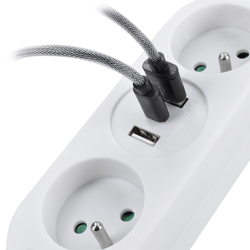 Prodlužovací napájecí kabel se dvěma zásuvkami a USB nabíječkou. Skladný, výkonný, lehce přenosný. Ideální pro nabíjení elektronických zařízení na cestách.