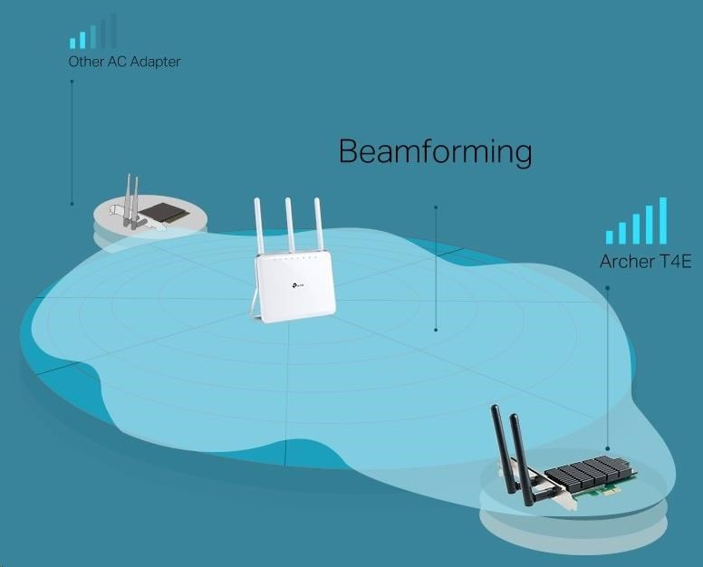 Archer T4E od TP-LINK podporuje pokročilý standard Wi-Fi IEEE 802.11ac, který nabízí 3krát vyšší přenosovou rychlost než standard IEEE 802.11n. V pásmu 2,4GHz můžete posílat e-maily a procházet web, zatímco volné rychlé pásmo 5GHz můžete využít pro hraní her, HD streaming a další aplikace vyžadující velkou šířku pásma.