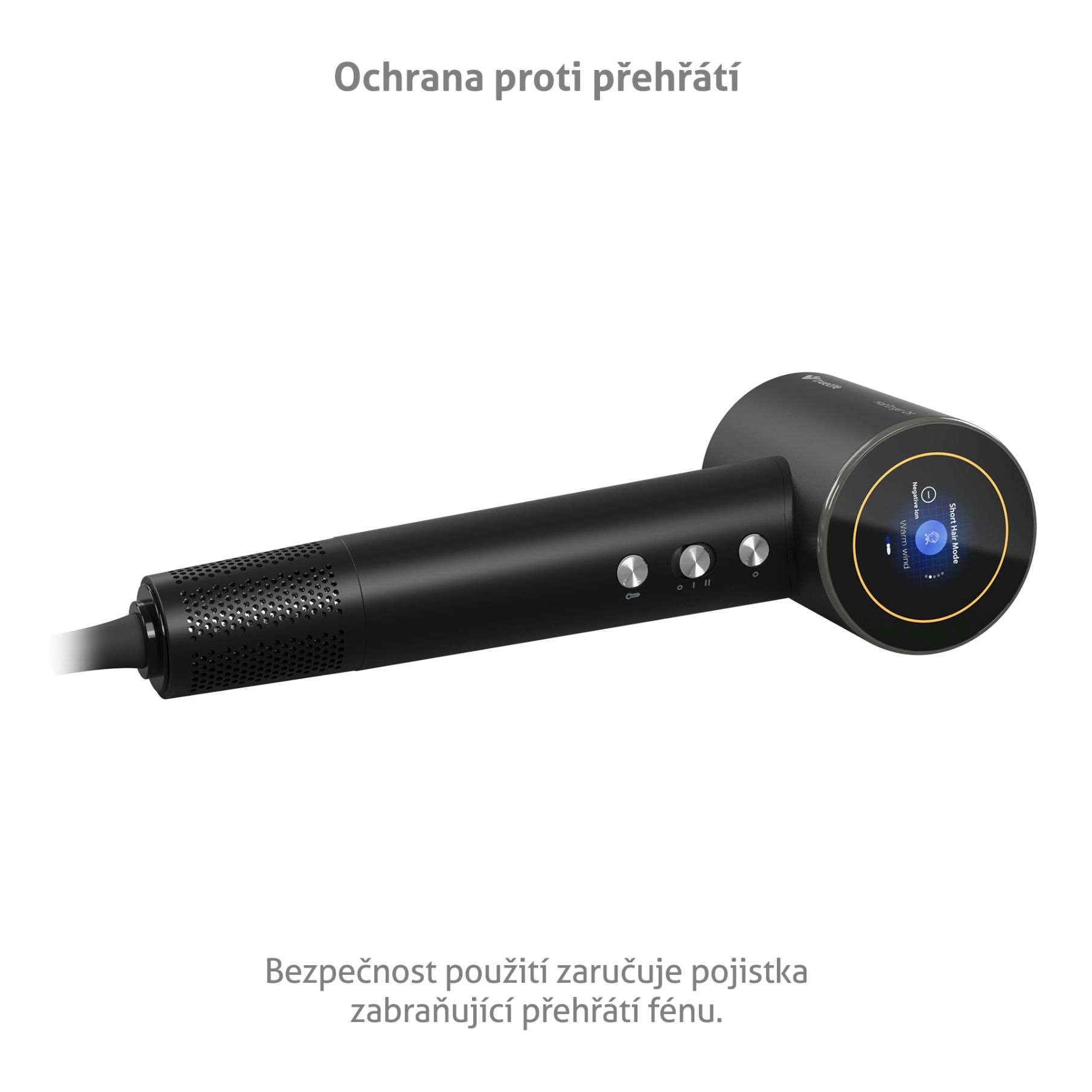 Fén je vybaven kulatým barevným LED displejem, který přehledně zobrazuje informace o fénování – zvolený mód, rychlost a ionizaci.