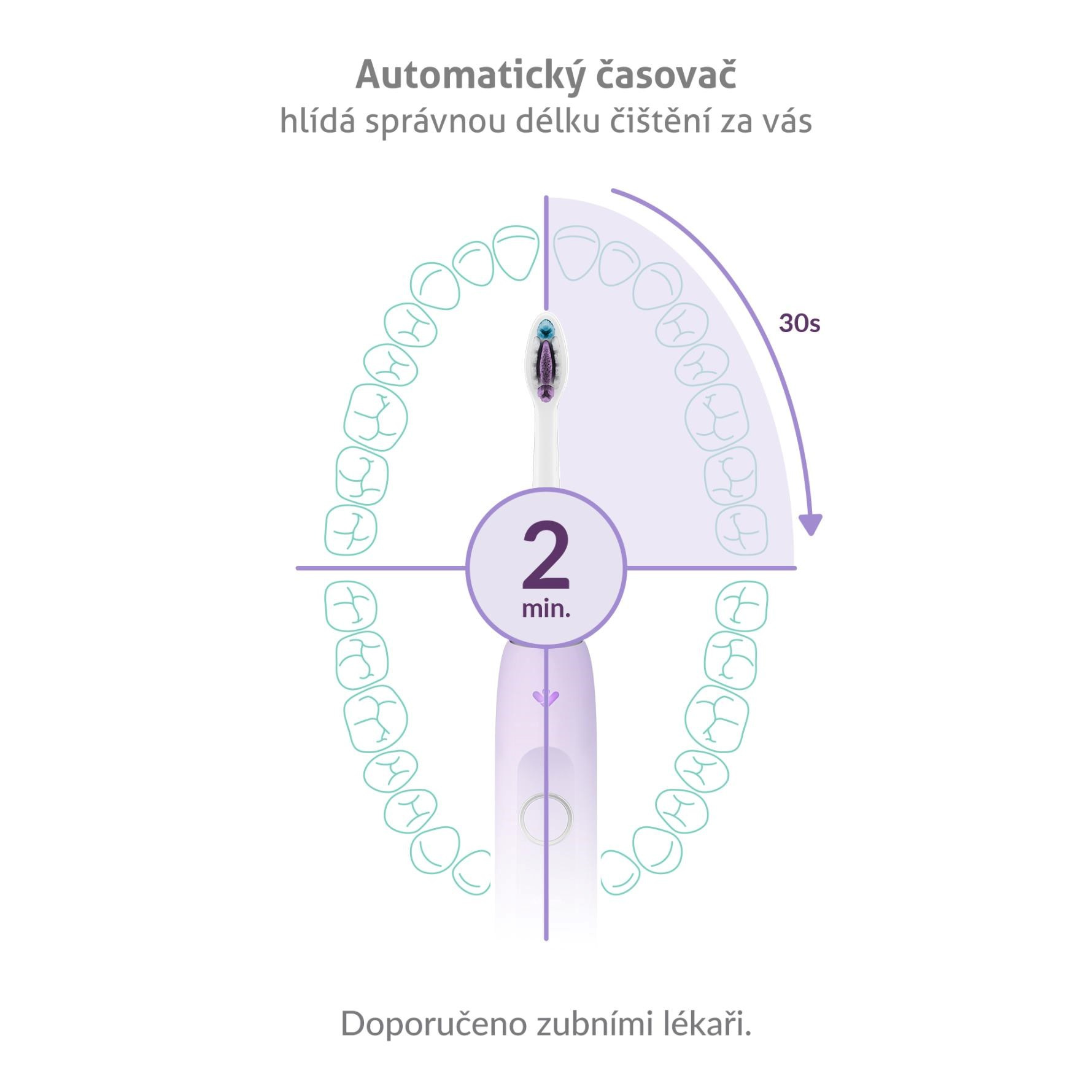 Zuby je ideální čistit po dobu 2 minut, což ohlídá automatický časovač. Navíc vždy po 30 vteřinách upozorní, že je potřeba přejít na čištění další části úst.