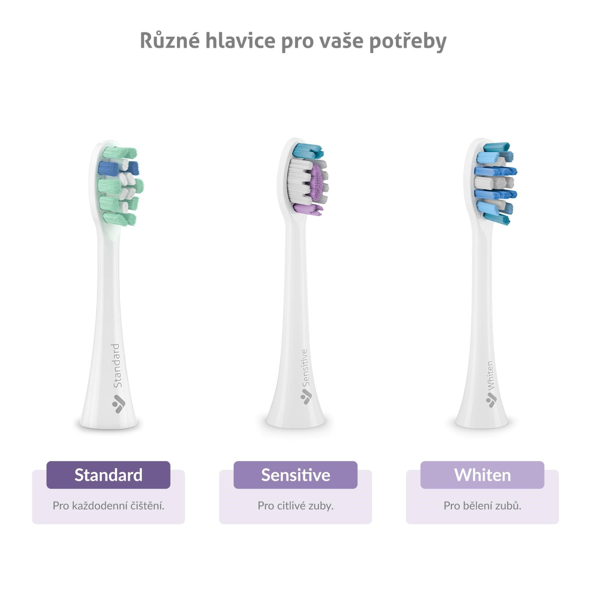 Balení sonického kartáčku zahrnuje 2 hlavice, které jsou určeny pro běžné každodenní čištění (Standard) a pro citlivé zuby (Sensitive). Dokoupit lze hlavici Whiten na bělení zubů.