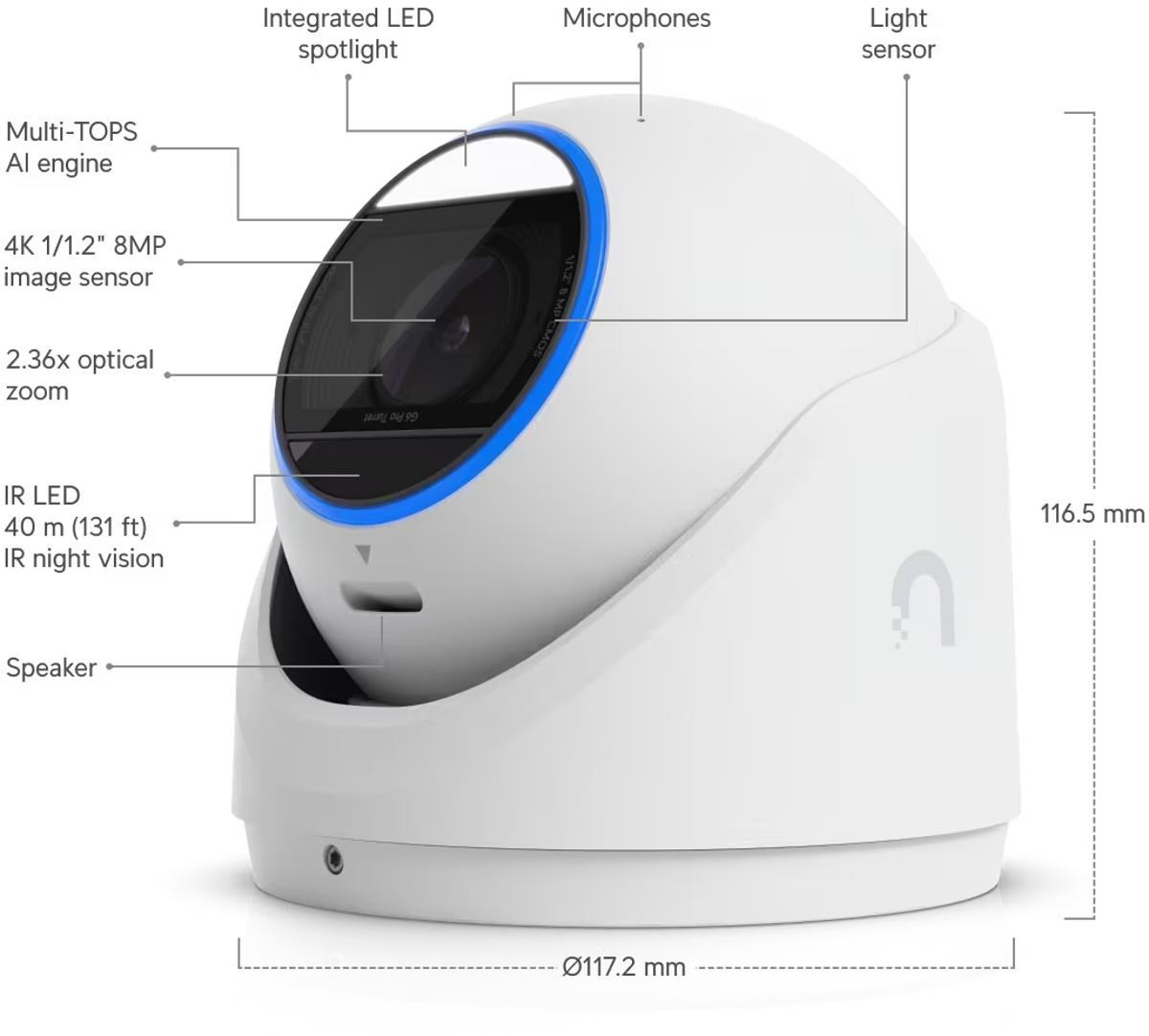 Popis produktu Ubiquiti UniFi IP turret hybrid kamera UVC-G6-Pro-Turret-W disponuje 8MP snímačem (3840 x 2160 px) při 30fps, variofokálním objektivem (5,85mm-13,8mm), kombinovaným IR/bílé světlo přísvitem pro noční vidění na vzdálenost až 40m, krytím IP66 a IK4 a vestavěnými mikrofony. Do sítě lze kameru připojit pomocí 1Gbit LAN s podporou napájení přes PoE+ s maximální spotřebou 15W. Klíčové vlastnosti • 8MP 30fps video (3840 x 2160 px) • Pokročilá AI detekce - odfiltrování falešných poplachů a spolehlivá detekce osob a vozidel • Hybridní Smart přísvit - IR/LED přísvit s dosahem 40m • Podporuje lokální záznam na microSD kartu nebo na NAS • Spravováno prostřednictvím UniFi Protect • IP66 kryt odolný proti povětrnostním vlivům • IK4 odolnost vůči vandalům • Napájení pomocí 802.3at 42.5-57V PoE+ Obsah balení • Zařízení • Šroubky, hmoždinky, nářadí • Držák na zeď/strop Technické parametry Kamera Zoom (optický):2,36x Typ objektivu:Varifokální - motorický Objektiv [mm]:5,85 až 13,8 (nastavitelný) Přísvit:Hybridní IR / bílé světlo Dosah přísvitu [m]:40 Pozorovací úhel [°]:45,5 až 113,8 Režim den/noc:Hybridní IR cut filtr / barevný Obrazový senzor ["]:1/1.2 Obraz Rozlišení:8MP Max. rozlišení [pixely]:3840 x 2160 (4K UHD) Konektory a rozhraní Slot na paměťové karty:microSD Audio:2 Mikrofony, Reproduktor Rychlost LAN:(1) 10/100/1000Mbps Napájení Napájení přes PoE:802.3at, 42 .. 57V DC Typ napájení:PoE Max. spotřeba energie [W]:15 Fyzické charakteristiky Stupeň krytí:IP66 Použití:Venkovní Antivandal (ochrana proti nárazu):IK4 Tlačítka:Reset Provozní teplota [°C]:-30 až 50 Hmotnost [g]:1200 Šířka [mm]:117 Výška [mm]:117 Hloubka [mm]:117 Barva:Bílá Obecné Kamerová řada:UniFi Protect Technologie a vymoženosti:Čtení SPZ, Face detection, Detekce vozidla, Multi-TOPS AI Engine.