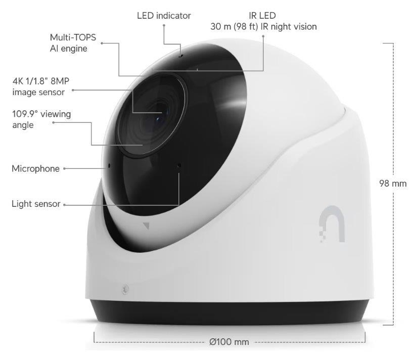 Popis produktu UniFi G6 Turret kamera disponuje 8MP snímačem s rozlišením 3840 x 2160 při 30fps a objektivem s pozorovacím úhlem 109.9°, který je vybaven IR přísvitem pro noční vidění do vzdálenosti 30m. Dále je kamera vybavena mikrofonem pro záznam zvuku, 10/100 Mbps LAN portem s podporou PoE a stupněm krytí IP66 pro použití ve venkovním prostředí. Kameru je možné napájet pouze prostřednictvím PoE adaptéru nebo switche podporující standard 802.3af a pasivní PoE (36-57V DC). Maximální spotřeba kamery je 12,5W! AI funkce Díky implementaci AI kamera podporuje pokročilé detekce jako jsou detekce obličeje, detekce SPZ nebo chytré rozpoznání objektů (osoba, vozidlo, zvíře). Důležité vlastnosti • 8MP, 30 FPS video • AI chytré detekce • Noční režim s IR LED diodami • IP66 kryt odolný proti povětrnostním vlivům • Vestavěný mikrofon • Spravováno softwarem UniFi Protect • Odolnost vůči vandalům - IK04 Obsah balení • Zařízení • Šroubky + hmoždinky • Držák pro přichycení ke zdi • Technické parametry • Kamera • Typ objektivu:Fixní • Přísvit:IR • Dosah přísvitu [m]:30 • Pozorovací úhel [°]:110 • Režim den/noc:IR cut filtr • Obrazový senzor ["]:1/1.8 • Obraz • Rozlišení:8MP • Max. rozlišení [pixely]:3840 x 2160 (4K UHD) • Konektory a rozhraní • Audio:Mikrofon • Rychlost LAN:(1) 10/100Mbps • Napájení • Napájení přes PoE:802.3af, 37 .. 57V DC • Typ napájení:PoE • Max. spotřeba energie [W]:12,5 • Fyzické charakteristiky • Stupeň krytí:IP66 • Použití:Venkovní • Antivandal (ochrana proti nárazu):IK4 • Tlačítka:Reset • Provozní teplota [°C]:-30 až 50 • Hmotnost [g]:550 • Šířka [mm]:100 • Výška [mm]:100 • Hloubka [mm]:98 • Barva:Bílá • Obecné • Kamerová řada:UniFi Protect.